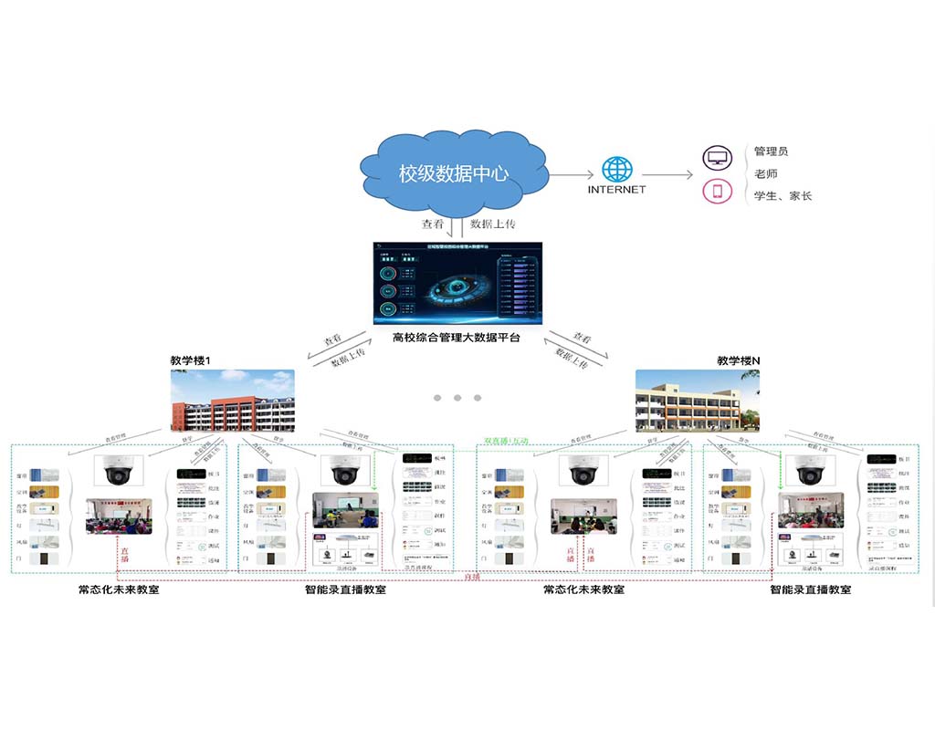 由后台及前端显示界面组成,将校园网之内的所有多媒体教室进行互联互通,实现大数据的实时采集以及统计功能,实现对教学设备运行状态的远程监测,实现对教室多媒体设备,灯光等的远程控制,实现对所有课堂的督学巡考,实现对课堂教学的常态化录制,提高学校管理人员管理效率,方便学校教学资源收集、存储和管理。